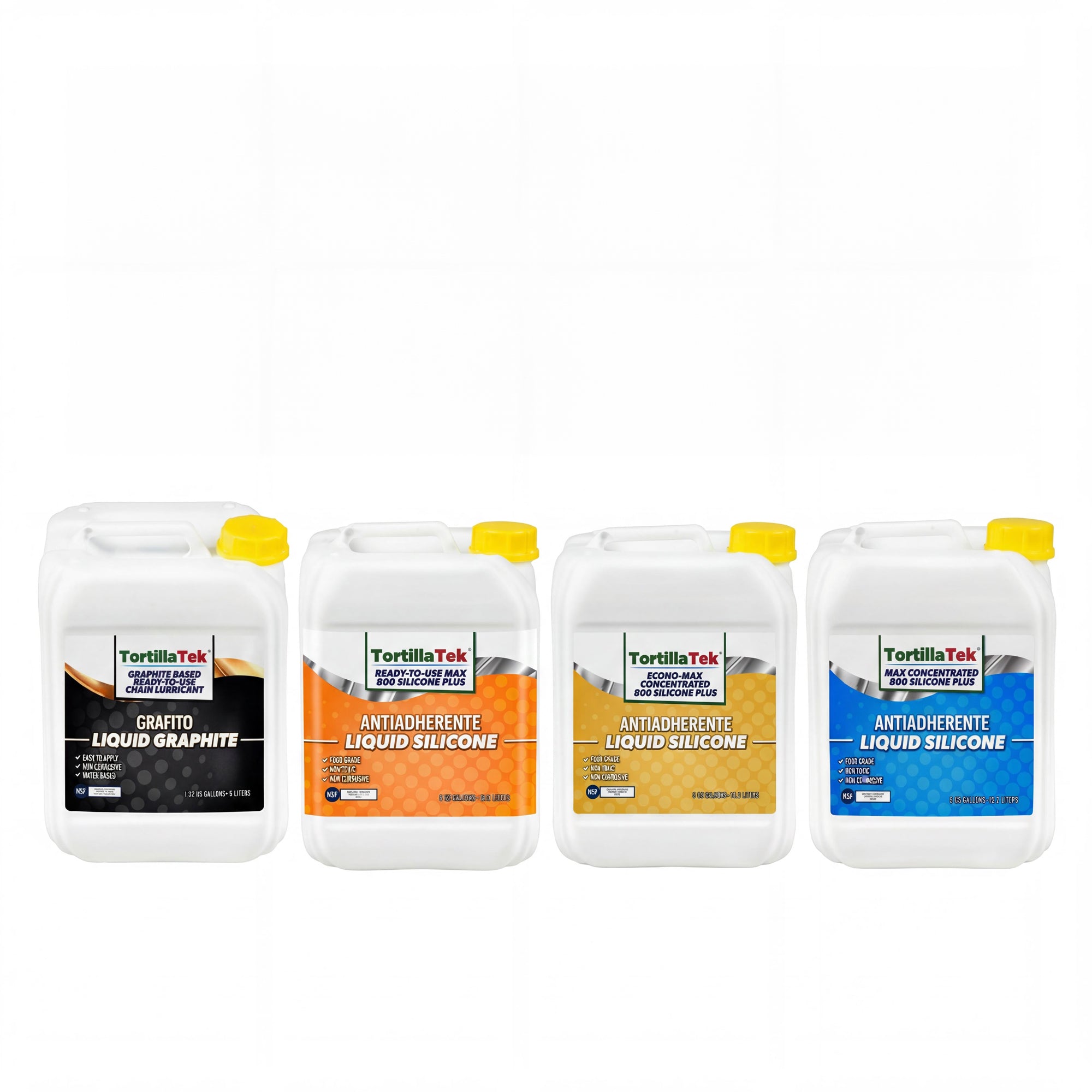 To ShopTortillaTeks liquid silicones in both, concentrated and Ready-To-Use formulas are food grade and NSF registered. We have MAX concentrated; it's our most concentrated silicone sold. Then ECONO-MAX concentrated. The most commonly used silicone in the tortilla industry with a (5 + 1 = 6) dilution ratio. It's one of our best sellers. The most convenient and easiest to apply is our Ready-To-Use MAX 800 SILICONE PLUS. It doesn't need water, just shake and apply. Try out our classic Eco-friendly non-toxic, non-corrosive, NSF registered and easy to apply Ready-to-Use graphite-based chain lubricant