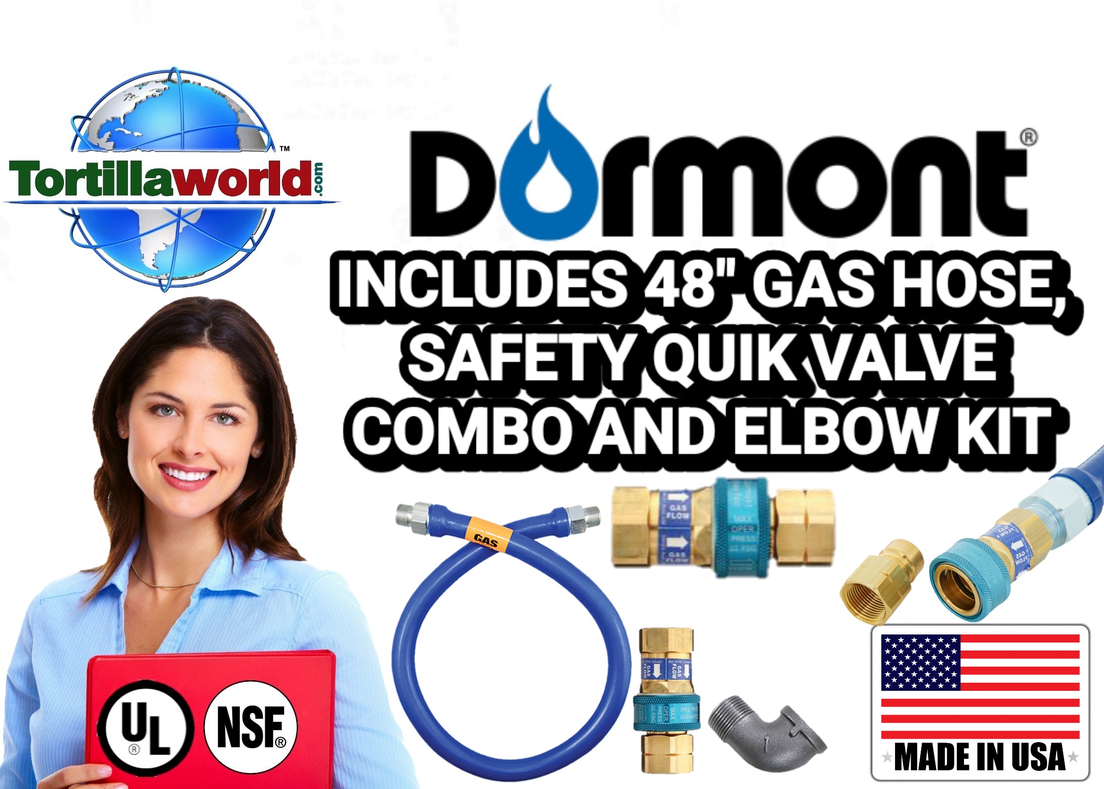 Commercial grade gas hose kit #16100BPCF48 contains, (1) 1-48″ long commercial grade movable gas hose connector composed of 301 stainless steel corrugated tube covered with a tight weave of stainless-steel braid specifically engineered for caster mounted commercial cooking & tortilla Industry equipment like traditional corn cooking tubs, tortilla chips, tostadas and churrito basket fryers from 30 per hour etc. The outside hose coating is an antimicrobial PVC coating that inhibits growth of bacteria, mold and mildew on the connector. Rotational technology fittings on both ends of the connector rotate 360 degrees, greatly reducing stress at both connector ends. (2) 1-1″ Safety quik disconnect valve is designed specifically for the food industry, meeting the safety and operational needs of commercial kitchens, doing the work of both a quick disconnect and a valve. The gas connector cannot be disconnected until the gas valve is shut off and cannot be opened until the gas connector is attached and employs a number of safety measurements while acting as a convenient quick disconnect fitting. The valve also has an internal thermal shutoff feature to protect against dangerous temperatures near the gas supply. (3) 1-1″ elbow