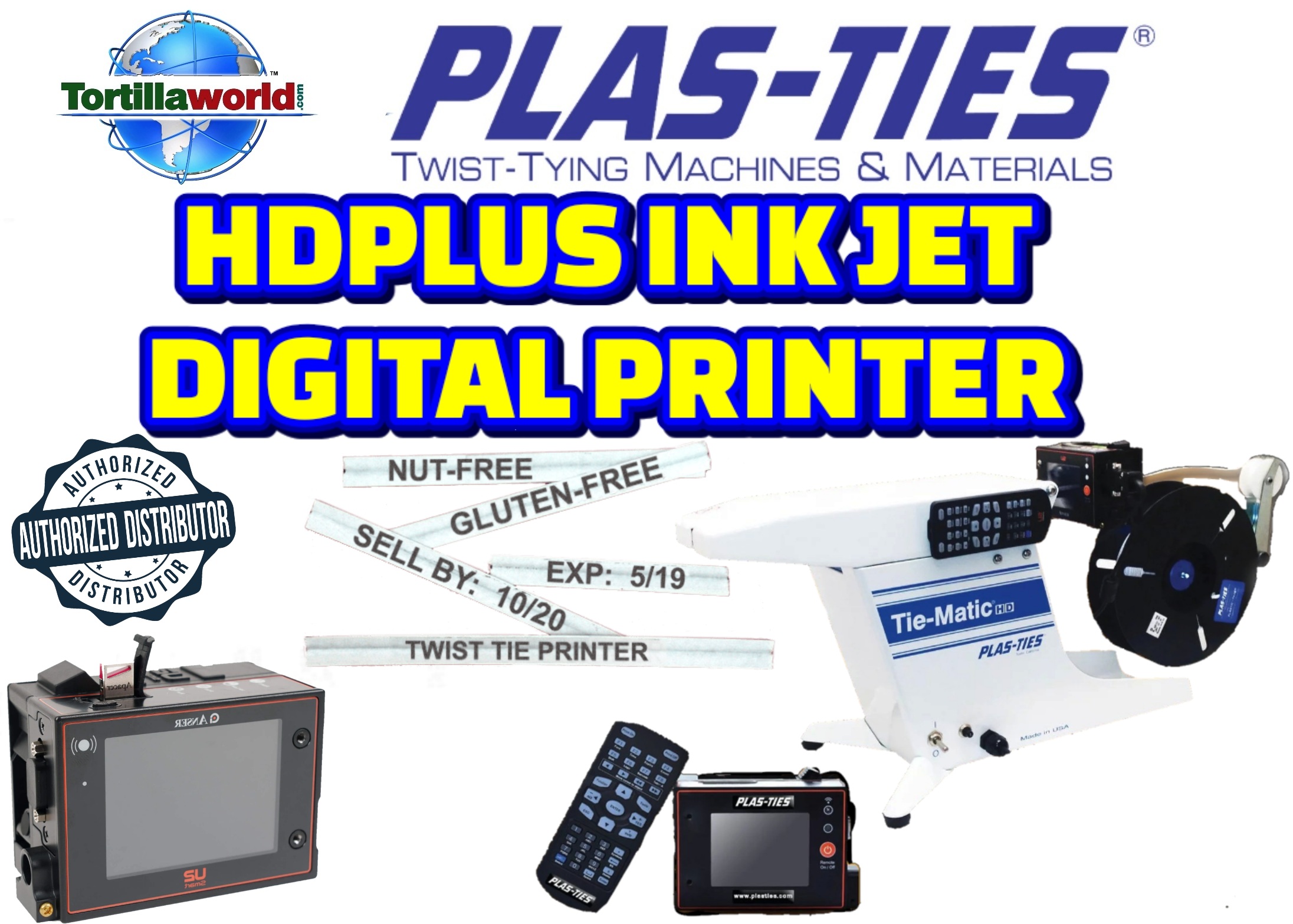 Tortillaworld is an authorized distributor of Plas-Ties who sells the complete line of the HD series twist-tying machines, materials, accessories & parts. The ink Jet printer solution package includes printer, assembly, controller & 1 ink cartridge. It is a versatile twist tie printer with precise placement and a compact size. Easily installed onto the Tie-Matic HD-series twist-tie machines. This complete package will allow you to close your bag & label your product in just 1 second. The Tie-Matic quickly twist ties your product & the Inkjet printer prints on the tie