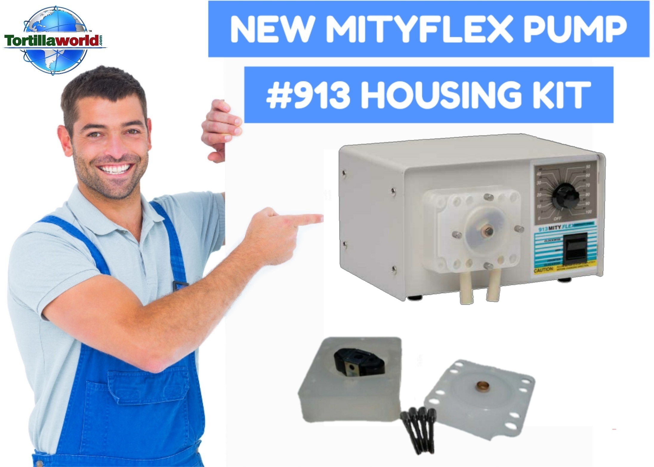 Original factory replacement parts kit includes housing cover, thumb screws, and roller bracket assembly.for the MityFlex # 913 chemical pump commonly used in the tortilla industry for dispensing liquid corn tortilla preservatives. Don’t replace the entire pump when all you need is the housing & roller bracket assembly. We have a few left