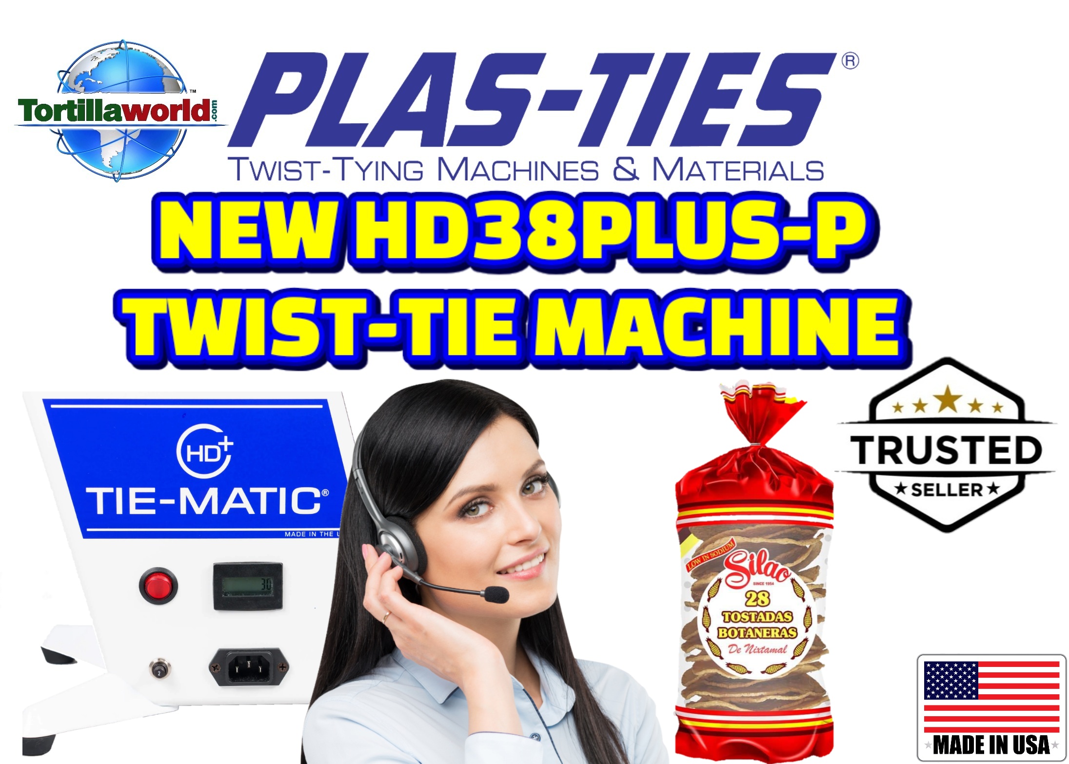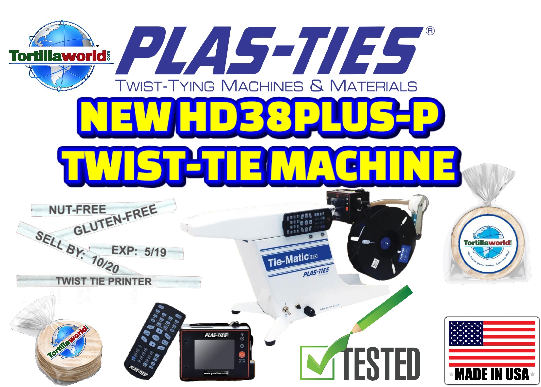 Tortillaworld is an authorized distributor of Plas-Ties who sells the complete line of HD-series Plas-ties twist-tying machines, materials, accessories & parts. The HD38PLUS-P Tie-Matic has been proven to work in the tortilla Industry for over 30 years. Close your bag and label your product in just one second. The new digital printer software allows you to to program the printed message instead of manually changing out the printed letters. The Tie-Matic HD38PLUS-P twist-tie machine. Its fast, durable & reliable