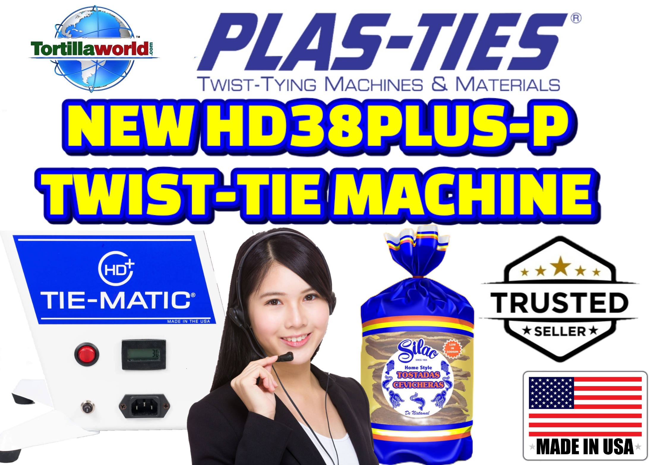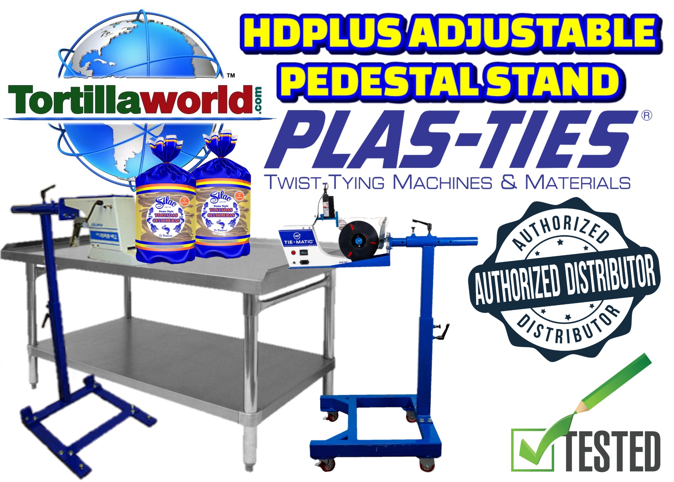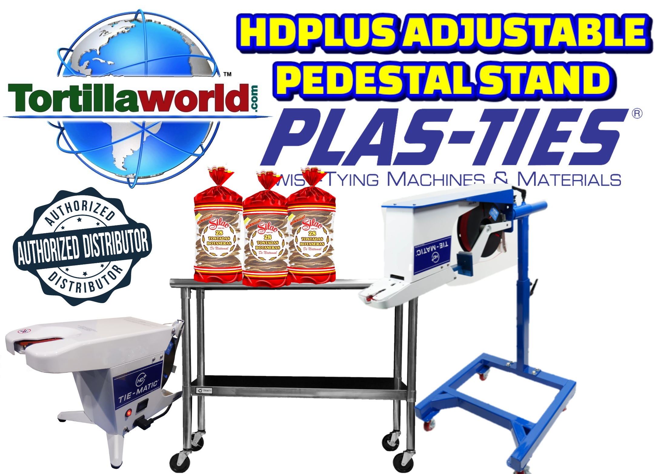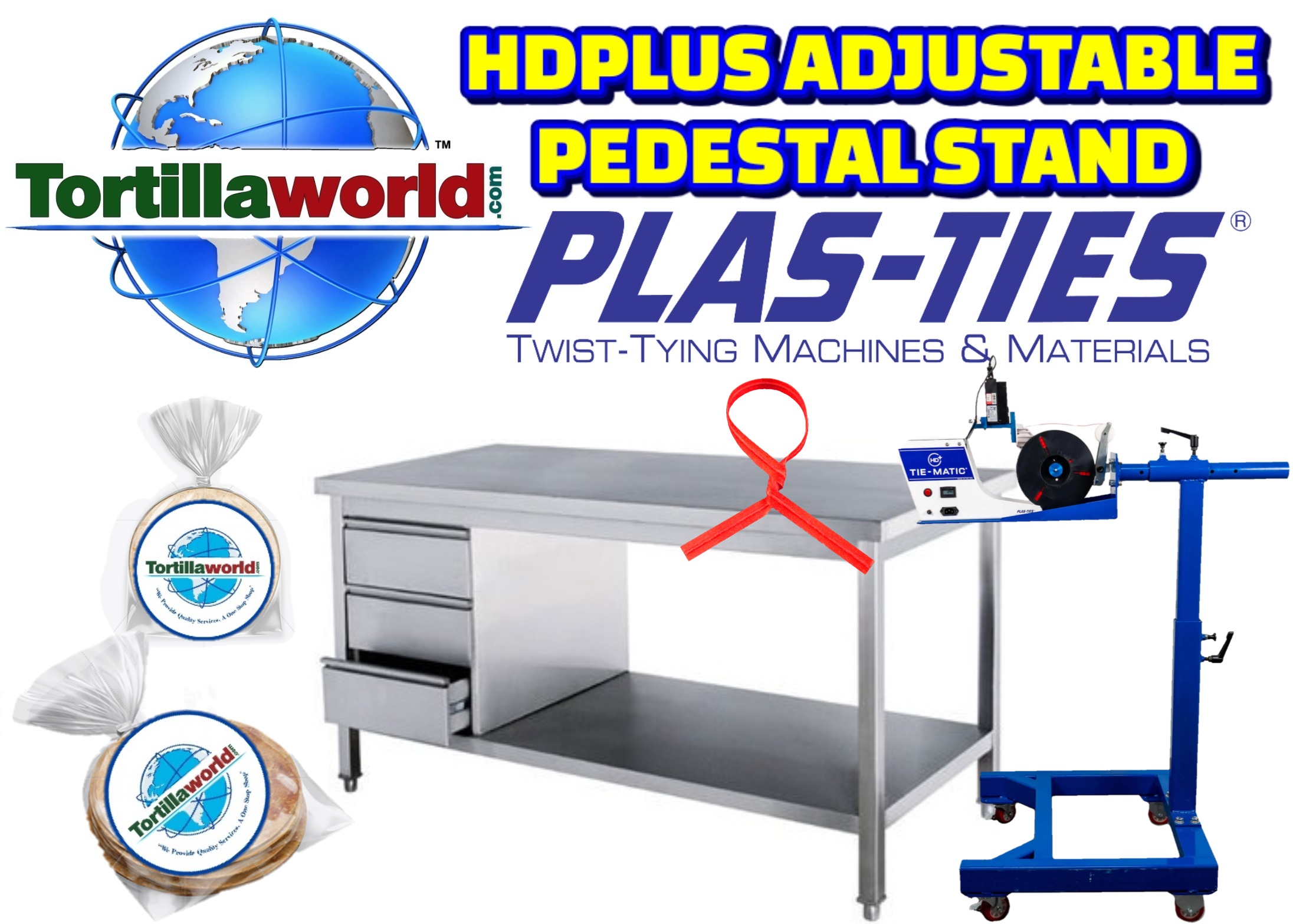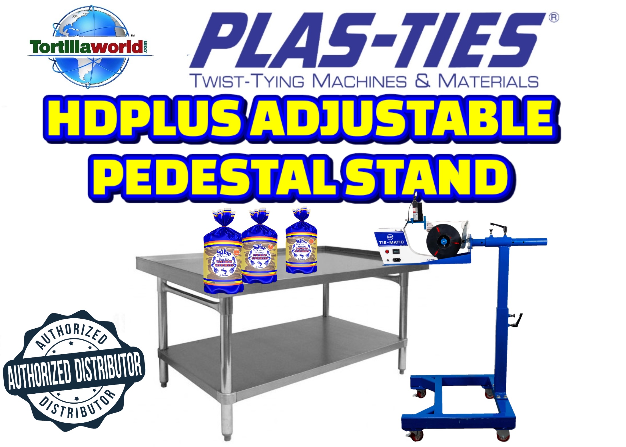 Tortillaworld is an authorized distributor of Plas-Ties who sells the complete line of HD-series twist-tying machines, materials, accessories & parts. The pedestal stand is essential for workstations requiring mobility, continual height adjustments, bag-in-box applications, or conveyor belt configurations. The Tie-Matic HD-series machines can be mounted on pedestal stands for optimal application tying access